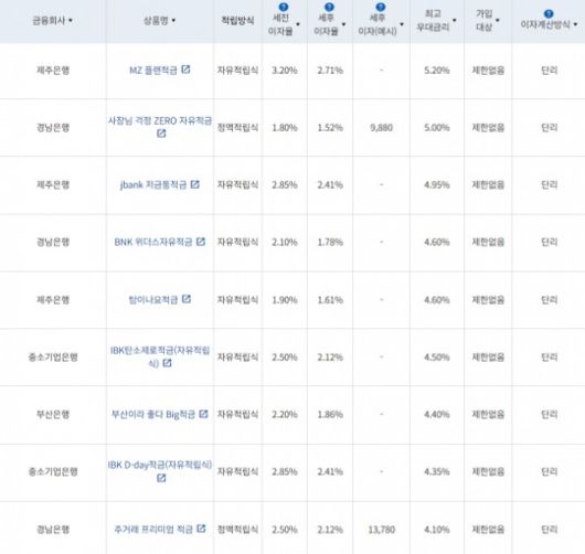 8일 금융감독원 금융상품통합비교공시에 따르면 제주은행 ‘MZ플랜적금’이 최고 우대금리 5.20%를 제공해 가장 높은 금리가 책정됐다. 이 상품의 세전이자율은 3.20%다. 우대조건은 ▲매월 1회 이상 지속적 납입시 1년제 0.50% ▲목표 금액 달성시 0.50% ▲신용카드,체크카드 합산 사용액 월 10만원 이상 사용시 0.50% ▲‘청년이니까응원합니다’ 이벤트로 0.50%가 붙는다. 월 납입한도는 30만원 이하다.