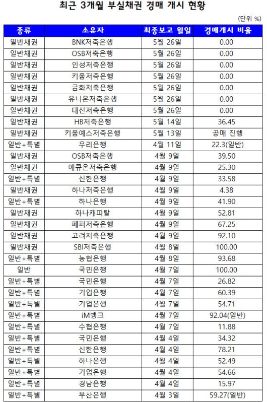 올해 3월부터 5월까지 은행과 저축은행 등 1·2금융권의 부실채권의 담보물이 경매에 넘어간 경우는 절반이 되지 않았다. BNK·OSB·인성·키움·금화·유니온·대신저축은행 등 2금융권의 부실채권 양도등록이 몰린 지난달 26일에도 경매 개시된 건은 없었다.