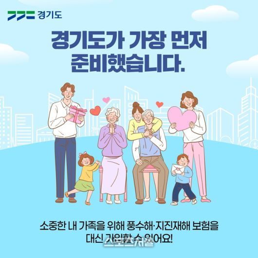 〔스포츠서울│수원=좌승훈기자〕경기도는 풍수해·지진재해보험의 사각지대 해소를 위해 가족이나 지인들이 대신 보험에 가입해 주는 ‘타인에 의한 가입’ 시스템을 전국 최초로 도입하고, ‘보험 선물하기’ 캠페인을 추진한다고 8일 밝혔다.