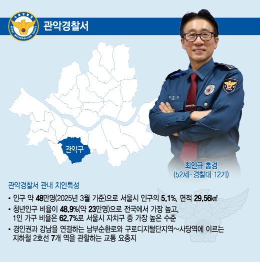 런던에서의 생활을 마친 최 서장은 지난해 8월 관악경찰서장으로 취임했다. 최 서장은 관악구에서 초·중·고교를 나온 관악 토박이다. 관악구는 동네마다 인구 특성이 다르다. 최 서장이 '지역 맞춤형 치안활동'에 주력하는 이유다. 최 서장은 지난해 12월 관악구 21개 행정동을 4개 그룹으로 나눴다. 청소년이 많은 성현동에선 학교 주변 유해업소를 단속하고, 청년층이 많은 신림동에서는 전세사기 및 성범죄 예방에 힘썼다. 노년층이 많은 삼성동에선 고령층 대상 범죄 예방 교육을 진행했고, 외국인이 많은 신사동에선 외국인 대상 순찰을 강화했다.