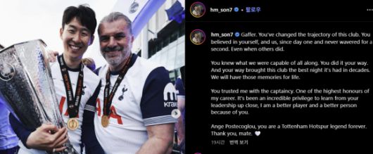 손흥민은 7일(현지시간) 자신의 인스타그램에 “포스테코글루 감독님, 당신은 이 클럽의 방향을 바꿨다. 단 한 순간도 흔들리지 않고 자기 자신과 우리를 믿어줬다”고 말했다. 이어 “당신은 우리가 뭘 할 수 있는지 항상 알고 있었다. 당신의 방식으로 해냈고, 우리 팀에 수십 년만에 가장 멋진 밤을 선사했다”며 “우리는 그 기억을 평생 간직할 것”이라고 말했다.