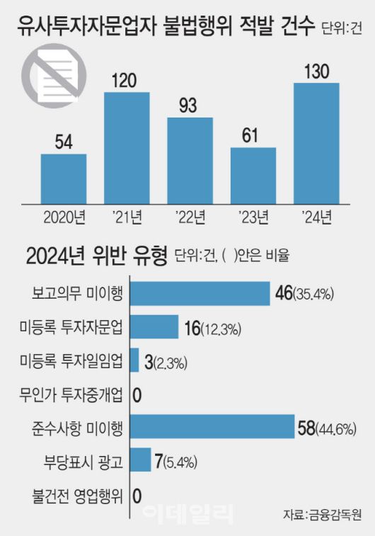 금융감독원은 한국거래소·금융투자협회와 함께 745개 유사투자자문업자를 점검한 결과 112개 업체에서 130건의 위법 혐의를 적발했다고 8일 밝혔다. 이는 전년 대비 54개사, 69건이 증가한 수치다. 이중 미등록 투자자문 등 형사처벌 대상 혐의를 받는 업체 18곳은 수사기관에 수사를 의뢰했다.