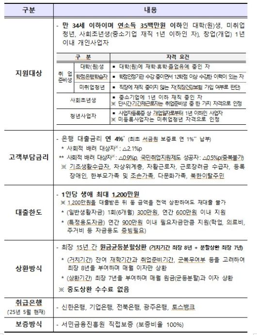 기초생활수급자, 차상위계층, 자활근로자, 근로장려금 수급자, 등록 장애인, 한부모가족 및 조손가족, 다문화가족, 북한이탈주민 등 사회적배려 대상자인 경우 대출금리가 종전 연 3.6%(보증요율 0.1% 포함)에서 연 2%로 1.6%포인트 낮아진다.