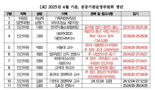 2025년 4월 기준, 공공기관운영위원회 명단. 정일영 의원실 |