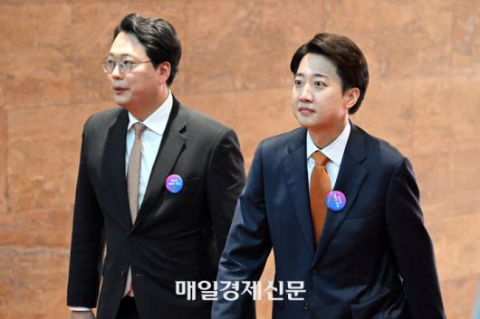 개혁신당 이준석 의원(오른쪽)과 천하람 의원이 4일 서울 여의도 국회 의사당 중앙홀(로텐더홀)에서 제21대 대통령 취임선서에 참석하고 있다. [김호영 기자] |