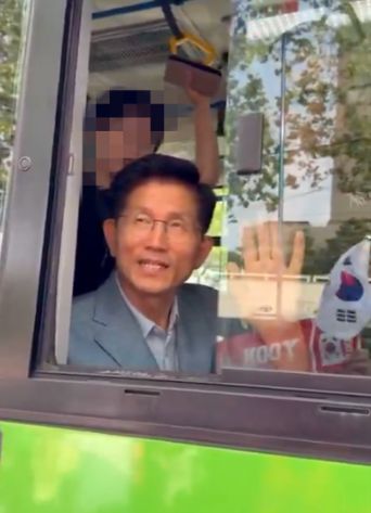 서초13번 마을버스에 탄 김 전 후보는 창밖에서 ‘윤 어게인’이 적힌 피켓을 흔드는 집회 참가자들에게 브이자를 들어 보이며 인사를 했다.