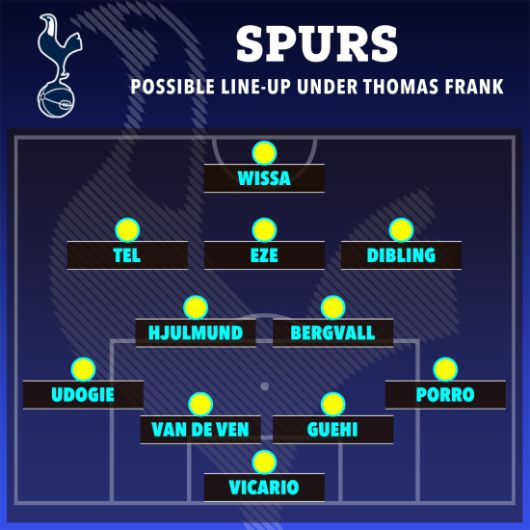 영국 매체 '더선'은 지난 7일(한국시간) 토트넘 홋스퍼 부임이 예상되는 토마스 프랭크 감독 체제에서의 선발 라인업을 예상했다.