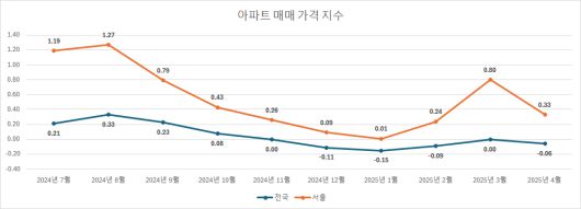 실제로 부동산 매매가격 지수를 보면 4월 기준 전기 대비 0.06% 감소했지만, 수도권은 같은 기간 0.06% 상승했다. 특히 서울은 0.33% 늘었다.