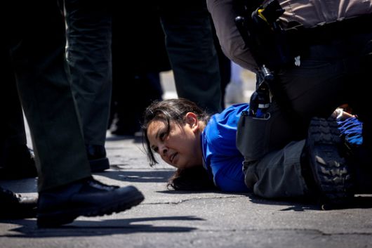 7일 미국 캘리포니아주 LA에서 이민국의 불법체류단속이 본격화한 가운데, 이민 단속에 반대하는 시위에 가담한 한 여성이 체포되는 모습. 로이터=연합뉴스 |