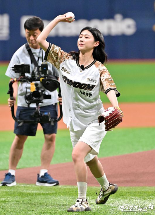 (엑스포츠뉴스 고척, 김한준 기자) 8일 오후 서울 구로구 고척스카이돔에서 열린 '2025 신한 SOL Bank KBO리그' LG 트윈스와 키움 히어로즈의 경기, 경기 전 KBS 홍주연 아나운서가 시구에 임하고 있다.김한준 기자 kowel@xportsnews.com