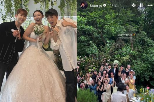 왼쪽부터 조권, 민, 장우영. 오른쪽은 민의 부케를 받은 조권의 모습. 조권 인스타그램 및 인스타그램 스토리 |