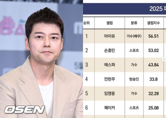 공개된 사진에 따르면 전현무는 포브스코리아가 선정한 ‘파워 셀러브리티 40’ 중 4위에 오른 모습. 아이유, 손흥민, 에스파에 이어 4위에 올랐고, 전현무를 이어 임영웅, 페이커가 뒤를 이었다. TOP5 중 방송인은 전현무가 유일한 모습.