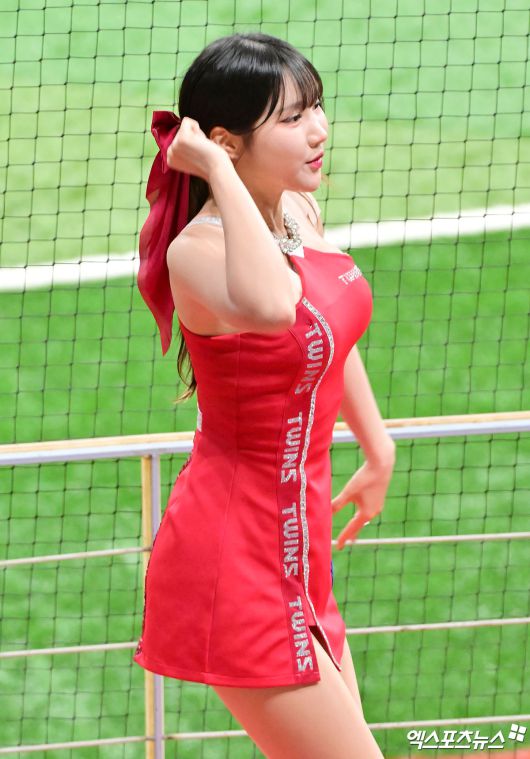 (엑스포츠뉴스 고척, 김한준 기자) 8일 오후 서울 구로구 고척스카이돔에서 열린 '2025 신한 SOL Bank KBO리그' LG 트윈스와 키움 히어로즈의 경기, 이진 치어리더가 멋진 공연을 선보이고 있다.김한준 기자 kowel@xportsnews.com