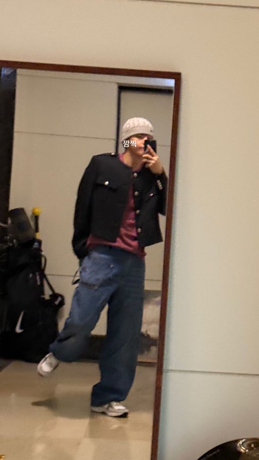 공개된 사진 속에는 뷔가 거울 앞에서 다리 한 쪽을 들고 귀여운 표정을 한 채 포즈를 취하고 있는 모습이 담겨 있다. 특히 뷔는 군복이 아닌 블랙 재킷에 청바지, 비니를 매치한 사복 패션으로 팬들의 시선을 사로잡았다.