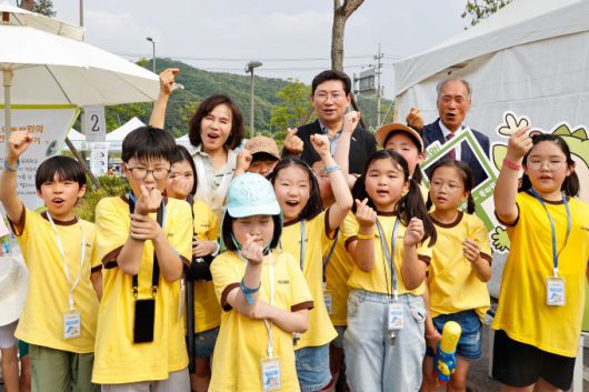이상일 용인시장, 최영철 용인문화원장, 김희정 용인교육장이 제34회 처인성문화제에 참석한 어린이들과 '손 하트' 포즈를 취했다. [사진=용인시] |