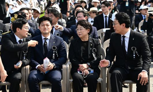 더불어민주당 박찬대 당 대표 권한대행 겸 원내대표(왼쪽부터), 국민의힘 김용태 비상대책위원장, 조국혁신당 김선민 당 대표 권한대행, 개혁신당 천하람 원내대표 겸 당 대표 권한대행이 6일 서울 동작구 국립서울현충원에서 열린 70회 현충일 추념식에 참석해 행사 시작 전 대화하고 있다. 대통령실사진기자단 |