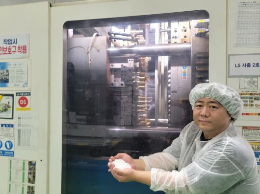 5일 제주삼다수 먹는샘물 생산라인에서 김준영 상품개발팀 대리가 재생페트칩이 사출성형기에 투입돼 프리폼이 생산되는 과정을 설명하고 있다.[사진=공동취재단] |