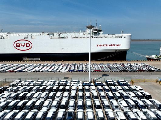 중국 전기차 업체 비야디(BYD)가 생산한 전기차들이 지난 4월 중국 장쑤성 연안도시 례윈강의 항구 부두에서 자동차운반선에 선적되기 전 주차된 모습. 2024.04.25. ⓒ 로이터=뉴스1 ⓒ News1 김성식 기자 |
