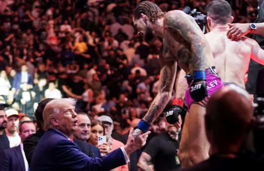 '배신자 머스크' 빼고 UFC 직관한 트럼프 7일(현지시간) 미국 뉴저지주 뉴어크 푸르덴셜센터에서 열린 종합격투기 UFC를 관람한 도널드 트럼프 미국 대통령(왼쪽)이 격투기 선수 션 오말리와 악수를 나누고 있다. 이날 관람에는 평소 UFC 경기를 함께 관전한 일론 머스크 테슬라 최고경영자(CEO) 모습은 보이지 않았다. 로이터연합뉴스 |
