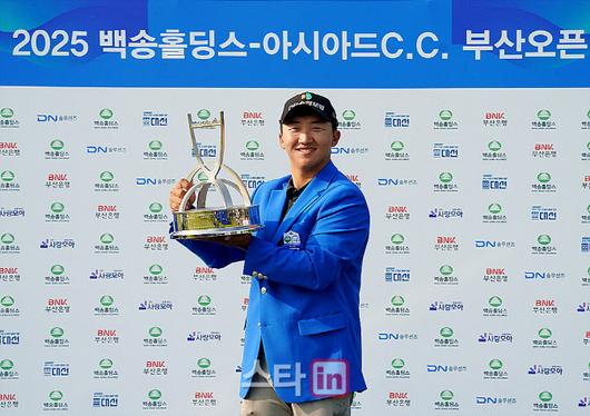 김홍택이 8일 부산 아시아드CC에서 열린 KPGA 투어 백송홀딩스 아시아드CC 부산오픈에서 통산 3승에 성공한 뒤 우승트로피를 들어 올리고 있다. (사진=이데일리 골프in 김상민 기자) |