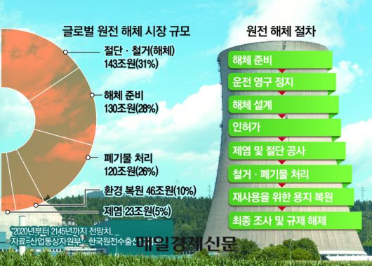 원전 해체란 원전 사용 연한이 끝나는 단계에서 시설을 영구적으로 폐쇄하고 용지를 철거하는 활동을 뜻한다. 일반적으로 해체 준비, 운전 영구 정지, 제염 및 절단 공사, 철거, 용지 복원 등 절차를 거친다. 국제원자력기구(IAEA)에 따르면 2022년 말 기준 영구 정지 원전은 204기에 달한다. 이 중 해체가 완료된 원전은 21기에 불과해 향후 원전 해체 시장 규모는 더 커질 전망이다. 2145년까지 글로벌 원전 해체 시장 규모는 500조원에 이를 것으로 관측된다.