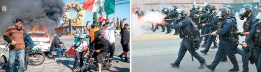 방화하는 시위대 vs 발포하는 경찰 7일(현지시간) 미국 캘리포니아주 로스앤젤레스(LA) 남부 패러마운트시에서 도널드 트럼프 행정부의 강압적인 불법 이민자 단속을 규탄하는 시위대가 도로 위 차량에 불을 붙이고 시위를 벌이는 가운데(사진 왼쪽) 6일 LA 도심 이민세관단속국(ICE) 청사에 시위대가 몰려들자 경찰이 섬광탄을 발포하며 시위대를 저지하고 있다. 로이터연합뉴스 |
