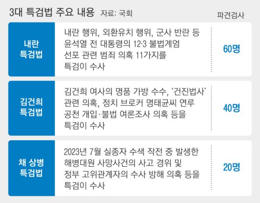 특검법에 명시된 수사 대상은 내란 특검 11개, 김건희 특검 16개, 채 상병 특검 8개이다. 3개 특검법 모두 ‘인지수사’가 가능해 사실상 수사 범위에 제한이 없어 그 대상은 더 넓어질 수 있다.