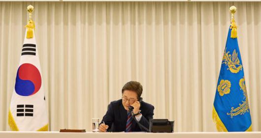 이재명 대통령이 6일 서울 한남동 관저에서 도널드 트럼프 미국 대통령과 전화 통화를 하고 있다. 대통령실 제공 |