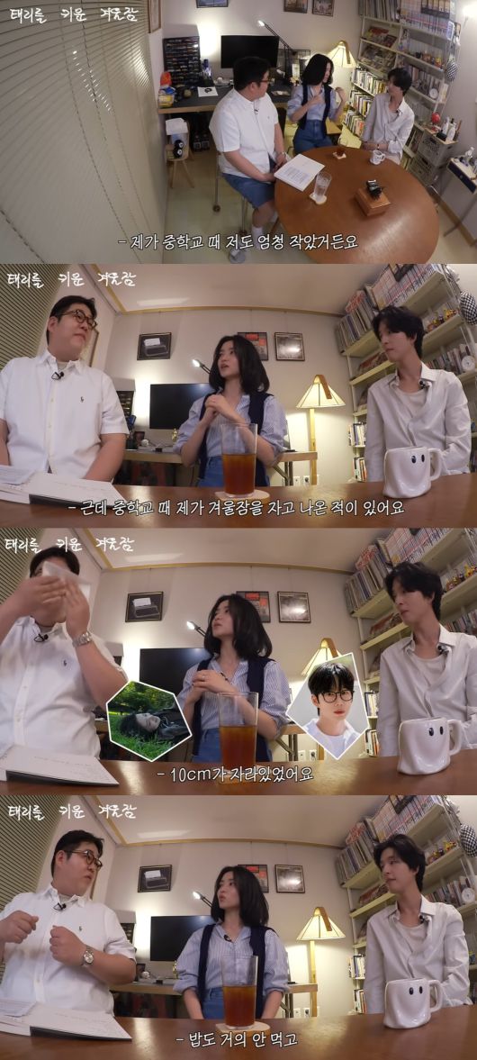 이에 문상훈이 “전 얼마전에 장염에 걸려서 잠만 14시간 잔 적이 있다”고 고백했다. 김태리는 “14시간은 기본이다. 잠 잘자는 사람은 공감할 거다”라며 “제가 중학교 때 엄청 키가 작았다. 항상 1번이었는데, 겨울잠을 자고 나온 적이 있다. 집 밖에 한 번도 안 나가고 방에서 계속 잠만 잤다. 그러고 나왔더니 10cm가 자라 있었다”고 밝혔다.