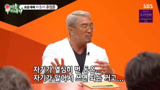 이에 서장훈은 "그럼 본인도 (아내에게) 안 알려주냐"고 물었다. 추성훈은 "당연히 그렇다"고며 "만약 1억 원이라고 하면 8000만 원 정도로 깎아서 이야기 한다, 너무 대놓고 이야기 하면 안 된다"고 덧붙여 웃음을 자아냈다.