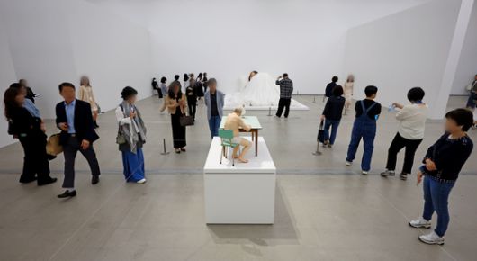 ‘ 론 뮤익’ 전이 개막 56일 만에 30만 관객을 넘었다. ‘치킨/맨’(앞)과 ‘침대에서’를 보는 관객들. [ 연합뉴스] |