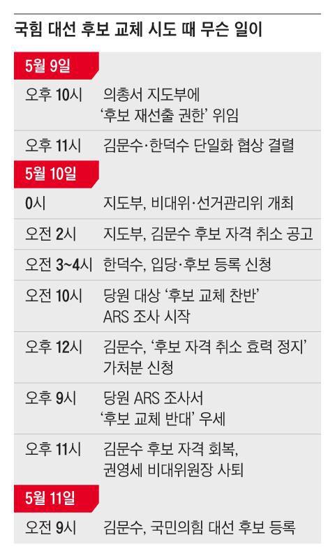 지난달 10일 국민의힘 지도부는 후보 등록 마감을 하루 앞두고 국민의힘 대선 후보를 경선에서 선출된 김문수 후보에서 한덕수 전 총리로 교체하려고 시도했다. 당시 후보 교체 안건이 부결되긴 했지만, 이 과정에서 김 후보가 법원에 후보 교체 결정 효력 정지 가처분 신청을 내며 법적 투쟁에 나서는 등 파문이 일었다.