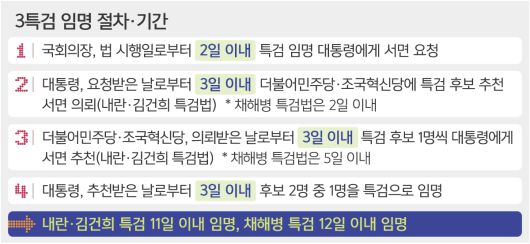 내란·김건희 특검법에 따르면 국회의장은 법 시행일로부터 2일 이내에 특별검사 임명을 대통령에게 요청하고, 대통령은 3일 안에 후보자 추천을 의뢰해야 한다. 더불어민주당과 조국혁신당이 3일 안에 특검 후보 1명씩을 추천하면 대통령은 3일 안에 후보 중 1명을 특검으로 임명한다. 채해병 특검의 경우 대통령의 후보자 추천 의뢰 기한이 2일, 각 정당의 후보자 추천 기한이 5일이다.