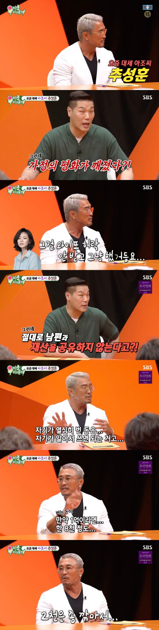 이에 서장훈은 추성훈 본인도 아내에게 수입을 다 공개하지 않는지 물었다. 그러자 추성훈은 "당연히 그렇다. 만약 1억이면 8천 정도 2천 깎고 이야기한다"라고 너스레를 떨었다.