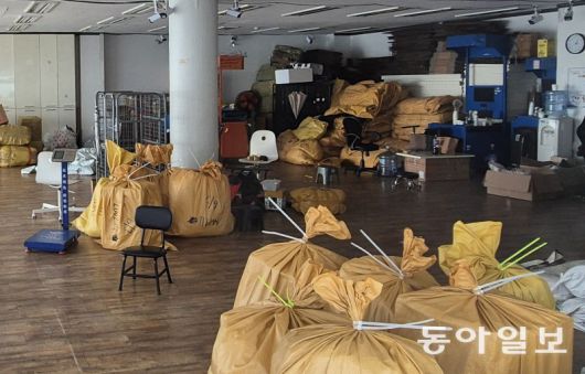 8일 서울 중구 신당동 봉제거리에 있는 한 폐업 봉제업체의 사무실. 각종 집기와 물품 꾸러미가 여기저기 놓여 있다. 홍진환 기자 jean@donga.com |