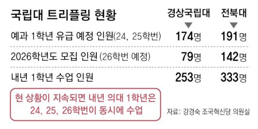 일부 국립대 의대에선 이미 내년도 1학기에 모집 인원의 3배가 넘는 학생이 수업을 듣는 ‘트리플링’을 앞두고 있다. 교육부는 올해 수업 불참 의대생에 대한 구제가 없다고 밝히며 전국 의대로부터 지난달 7일까지 유급·제적 현황을 받았다.