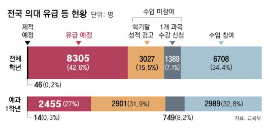 전국 의대생 43% 유급 처리 통보… 유급 피하려 1과목 수강신청 다수
