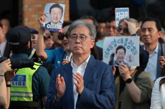 김현종 전 국가안보실 차장이 지난달 29일 서울 서초구 고속터미널광장에서 열린 이재명 더불어민주당 대선후보의 유세에서 이 후보의 연설을 듣고 있다. 고영권 기자 |