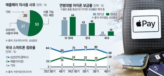 시장조사업체 카운터포인트리서치에 따르면 지난해 4분기 기준 국내 스마트폰 점유율은 삼성 60%, 애플 39%다. 삼성전자는 그간 삼성페이를 앞세워 한국 내 안드로이드 결제 생태계를 주도해왔다. 하지만 애플페이가 본격 확산되면 ‘갤럭시 고착 효과’는 약화될 수밖에 없다는 우려가 나온다.
