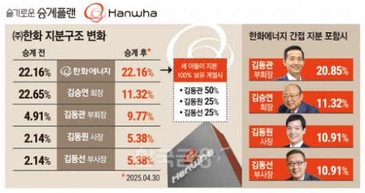한화에너지는 삼형제가 지분 100%를 가지고 있다. 첫째 김동관 부회장이 50%, 둘째 김동원 사장과 셋째 김동선 부사장이 각 25%씩 갖고 있다.
