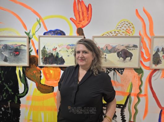 세계적인 그림책 작가인 키티 크라우더가 자신의 한국 첫 원화전이 열리고 있는 서울 용산구 알부스갤러리를 찾아 작품 앞에서 미소 짓고 있다. |