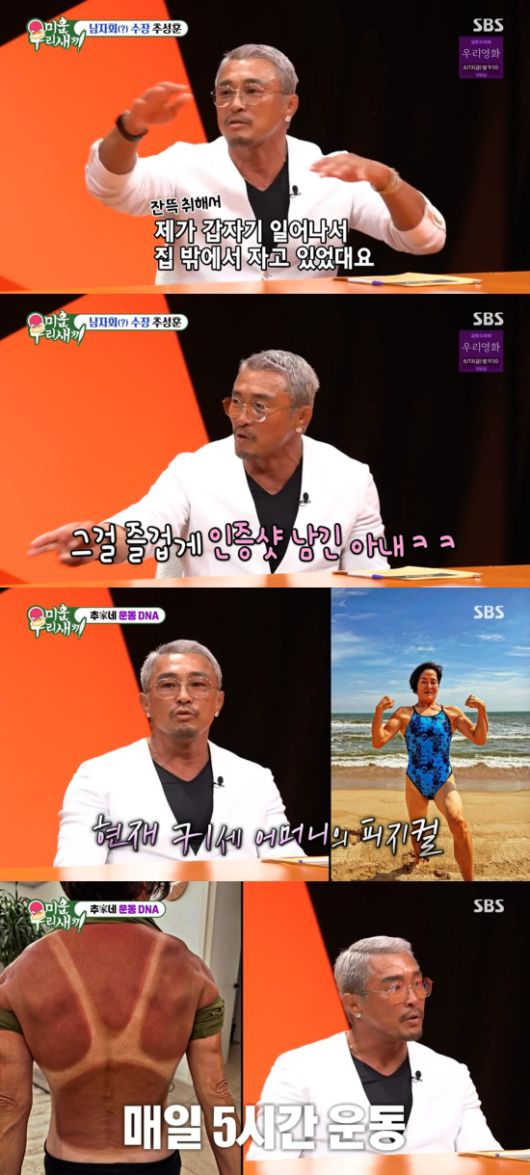 한편 추성훈은 남다른 피지컬의 어머니에 대해 "어머니가 수영선수였다. 지금 71세인데 근육이 이렇게 많다. 지금도 매일 하루에 5시간 정도 운동한다. 몸이 수영 때문에 수영복 자국으로 탔다"고 설명했다.