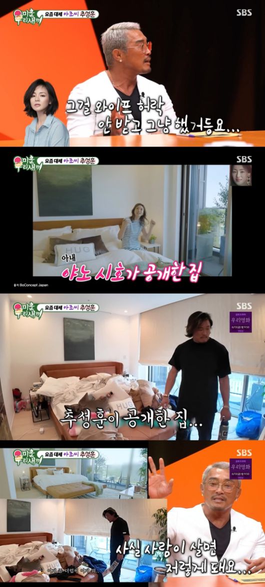 최근 유튜브를 통해 집 공개를 했다가 가정에 평화가 깨질 뻔했다는 일화도 오픈했다. 추성훈은 "(유튜브에서) 집 안을 소개해달라고 했다. 그래서 편하게 있는 그대로 집을 공개했다. (이유가) 와이프 허락을 안 받았다"고 운을 뗐다.