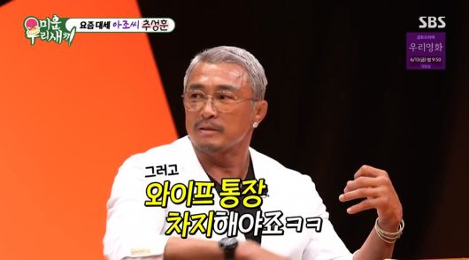 이에 추성훈은 "그 벌레가 와이프라는 걸 아는 거냐? 그러면 키워준다. 대신에 통장은 (내가) 차지한다. 인간이 감사하게 쓰겠다"고 해 폭소를 유발했다.