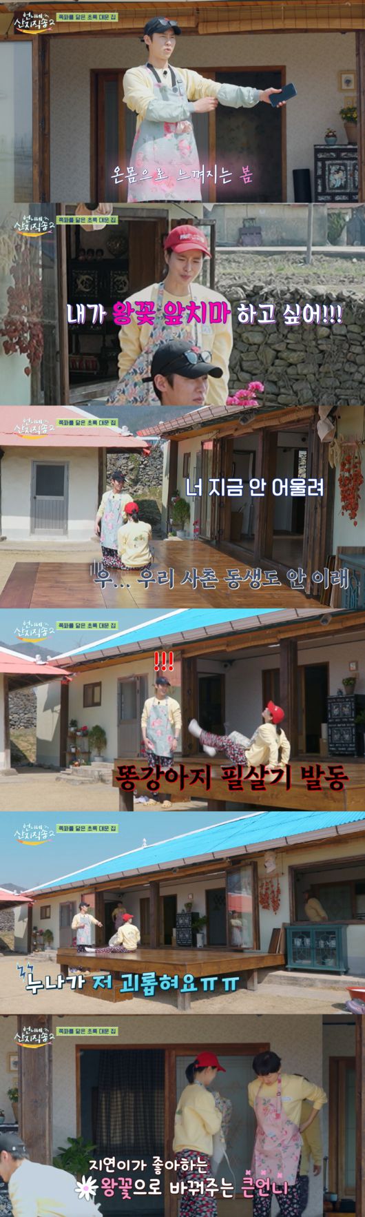 이날 멤버들은 꽃무늬 바지와 앞치마로 깔맞춤한 패션을 완성했다. 그런데 임지연의 눈에 들어온 건 다름 아닌 이재욱의 앞치마. 꽃무늬 패턴이 더 예쁘다며 “너 앞치마 나랑 바꿔”라고 말문을 연 임지연은 이내 “나 저거 하고 싶어, 빨리 내놔”라며 바닥에 주저앉아 생떼를 부리기 시작했다.