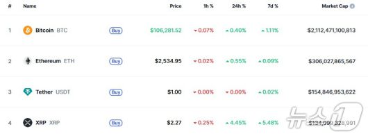 9일 오전 6시 20분 현재 글로벌 코인 시황 중계사이트인 코인마켓캡에서 비트코인은 24시간 전보다 0.40% 상승한 10만6281달러를 기록하고 있다.