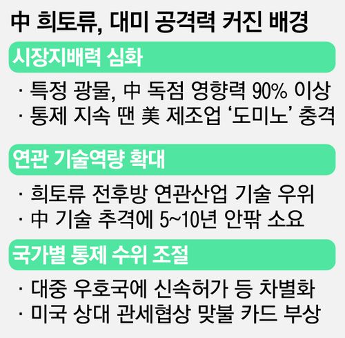 희토류 카드의 협상력이 커진 데는 중국이 전 세계 희토류 시장에서 독점적 지위를 갖고 있기 때문이다. 중국은 세계 희토류 채굴의 약 70%, 가공의 90% 이상을 담당한다. 수출통제가 지속되면 미국 제조업 타격은 불가피하다. 또 중국이 희토류 연관 산업에서 기술 우위에 있다는 점도 영향을 준다.