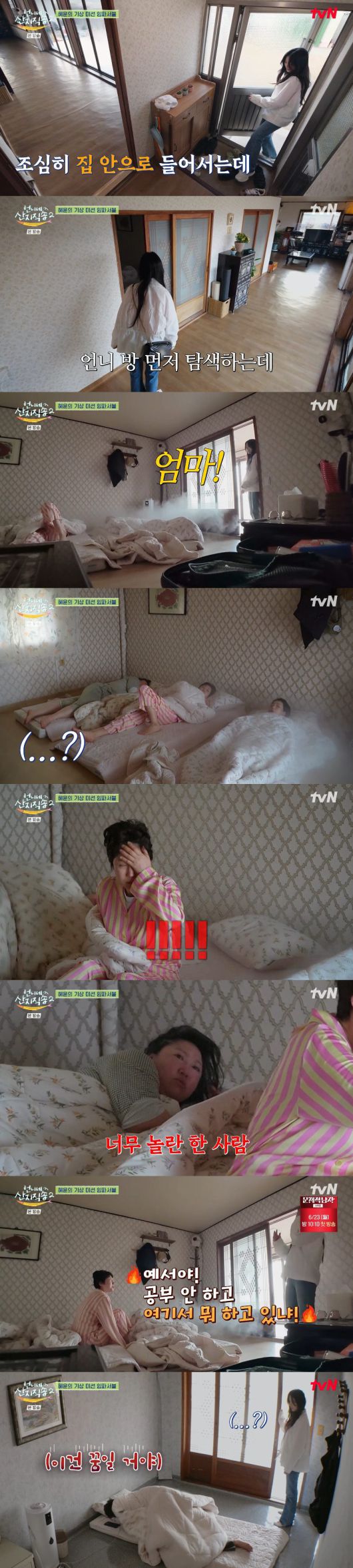 '산지직송' 최초 기상 전 게스트 등장에 사 남매는 꿈에도 모른 채로 잠에 들어 있었고, 집 앞에 도착한 김혜윤은 "너무 예쁘다. 집이"라며 감탄한 뒤 발소리도 죽인 채 조심스레 문을 열고 들어갔다.