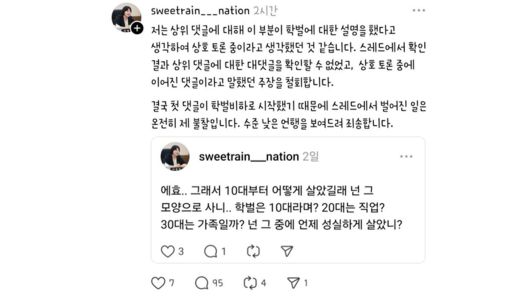 그러면서 "(당초) 저는 상위 댓글에 학벌에 대해 설명하고 상호 토론 중이라고 생각했던 것 같다"며 "확인 결과 상위 댓글에 대한 대댓글을 확인할 수 없었고, 상호 토론 중에 이어진 (비하 발언을 한) 댓글이라고 말한 주장을 철회한다"고 덧붙였습니다.