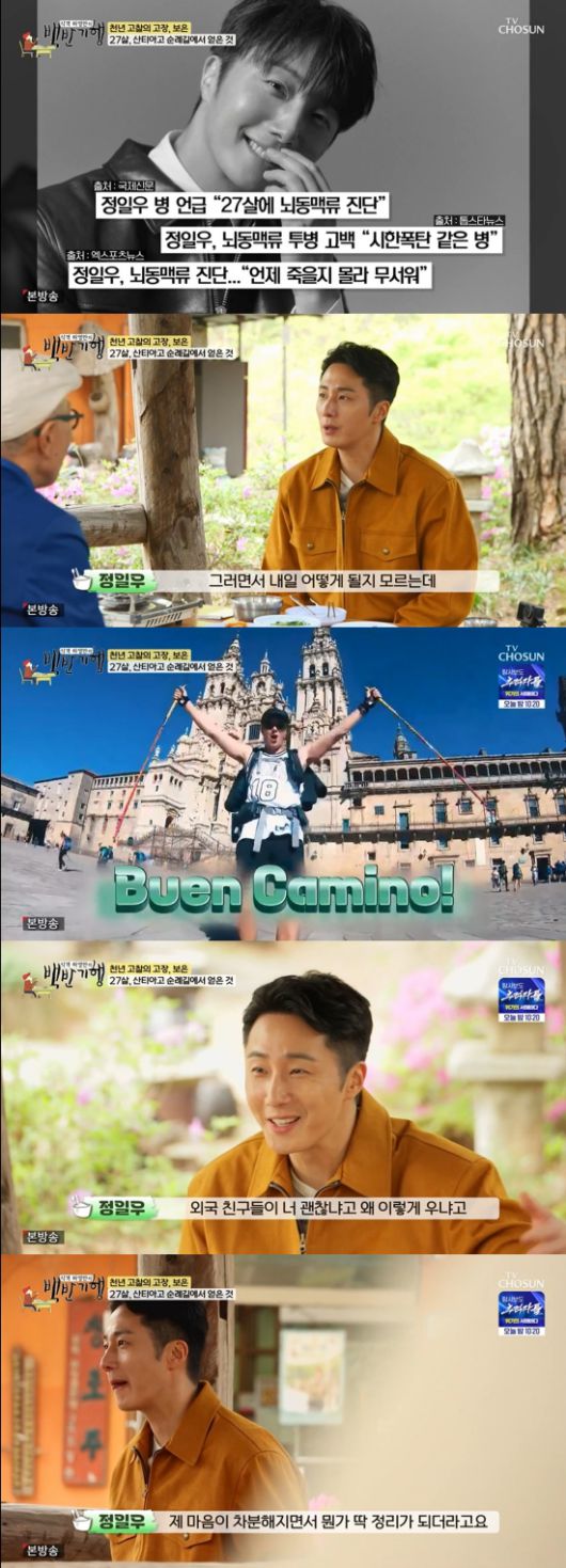 27세에 뇌동맥류 진단을 받았던 일도 언급했다. 정일우는 "제가 산티아고를 세 번 다녀왔다. 20대 때 한참 일하다가 뇌동맥류 진단을 받았다. 눈앞이 깜깜해지더라. 내일 어떻게 될지도 모르는데 한 번 가보자 했다. 산티아고 대성당에서 일요일마다 순례자를 위한 미사를 한다. 그때 미사를 보면서 펑펑 울었다"고 털어놨다.